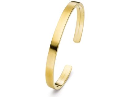 handgefertigter Armreif aus 750/- Gelbgold, matt, 7 mm breit, oval, flexibel, geöffnete Armspange, 69 mm
