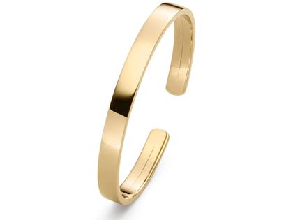 handgefertigter Armreif aus 750/- Gelbgold, poliert, 7 mm breit, oval, flexibel, geöffnete Armspange, 69 mm