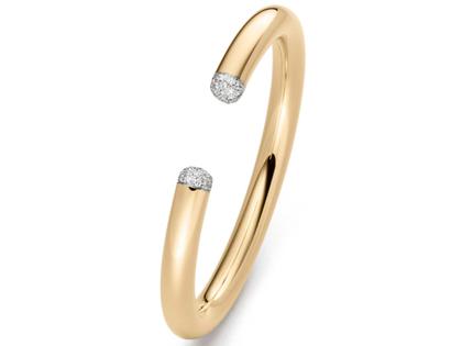 handgefertigter Armreif aus 750/- Roségold, poliert, rund, Durchmesser 7 mm, flexibel, geöffnete Armspange, 750/- Weißgold-Enden mit Brillanten 0,68ct TW vvsi Pavée ausgefasst