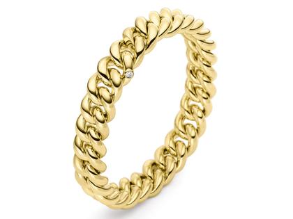 Handgefertigtes Gourmette Armband aus 18 Karat Gold. Das Armband hat eine Breite von 12 mm. Ein unsichtbarer Klappverschluss vollendet das reduzierte Design. Der 0,05 ct. Brillant im Verschluss zeigt der Trägerin die Stelle, an welcher sie ihr Schmuckstück öffnen kann. Collier und Armband können miteinander verbunden werden, um sie als lange Kette zu tragen.