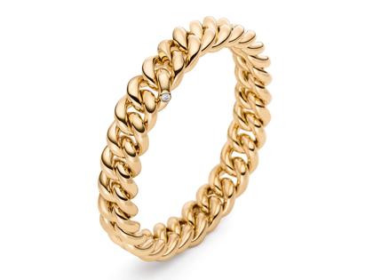 Handgefertigtes Gourmette Armband aus 18 Karat Gold. Das Armband hat eine Breite von 12 mm. Ein unsichtbarer Klappverschluss vollendet das reduzierte Design. Der 0,05 ct. Brillant im Verschluss zeigt der Trägerin die Stelle, an welcher sie ihr Schmuckstück öffnen kann. Collier und Armband können miteinander verbunden werden, um sie als lange Kette zu tragen.