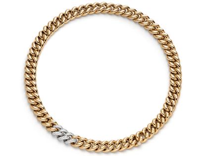 Handgefertigtes Gourmette Collier aus 18 Karat Gold. Die Kette hat eine Breite von 12 mm. Ein unsichtbarer Klappverschluss vollendet das reduzierte Design. Der 0,05 ct. Brillant im Verschluss zeigt der Trägerin die Stelle, an welcher sie ihr Schmuckstück öffnen kann. Collier und Armband können miteinander verbunden werden, um sie als lange Kette zu tragen.