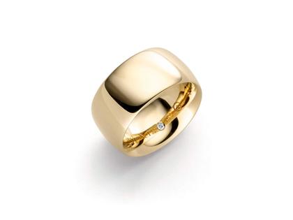 handgefertigter Ring aus 750/- Gelbgold, poliert, 11 mm breit, innen Brillanten 0,015 ct TW vvsi