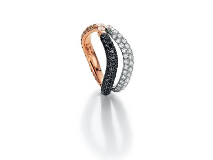 Damenring aus 750/- Weiß- und Roségold, poliert, mit weißen, braunen und schwarzen Brillanten zusammen 1,80 ct