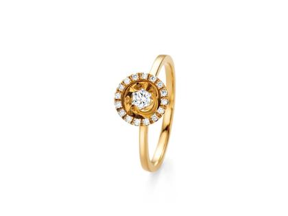 Ring aus 750/- Gelbgold poliert, 16 kleine und 1 großer Brillant zusammen 0,180 ct TW (G) si, Mittelstein beweglich
