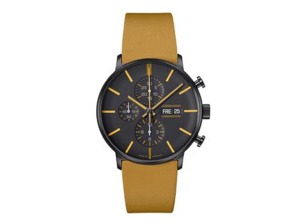 Junghans FORM A Chronoscope Automatik Edelstahl PVD-Sschwarz 42mm schwarzes Zifferblatt gelbes Lederband