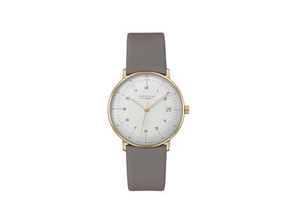 Junghans Max Bill Automatic Edelstahl PVD-Gelbgold 34mm graues Zifferblatt graues Lederband