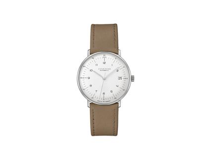 Junghans Max Bill Kleine Automatic Edelstahl 34mm silbernes Zifferblatt braunes Lederband