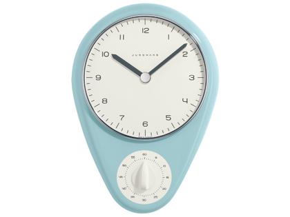 Mit der Küchenuhr begann 1956 die Zusammenarbeit zwischen Junghans und Max Bill. Jetzt legt Junghans diesen Klassiker in hellblauer Keramik wieder neu auf.  Was sagte der Designer selbst zu seiner Kreation? „Es war klar: Zahlen musste das Ding haben. Die Stunden an der Minuterie – und die Minutenzahlen am Kurzzeitmesser. Warum? Oft ist im Haushalt die Küchenuhr die einzige Wanduhr. Daran lernen die Kinder die Zeit erkennen, die ersten Zahlen lesen, die Ordnung von Stunde und Tag. Und hell und freundlich sollte sie sein, wie schönes Küchengeschirr.“