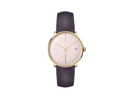 Junghans Meister fein Kleine Automatic Edelstahl PVD-Gelbgold 35mm rosa Zifferblatt auberginefarbenes Lederband