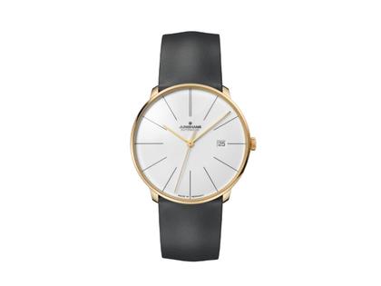 Junghans Meister fein Automatic Edelstahl PVD-Gelbgold 39mm weißes Zifferblatt schwarzes Lederband