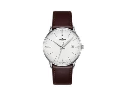 Junghans Meister Mega Funkuhr Edelstahl 38mm silbernes Zifferblatt braunes Lederband