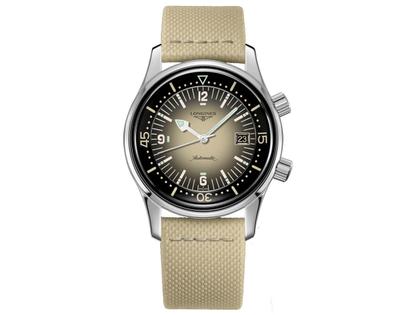 Heritage Legend Diver Watch, runde Herrenuhr, Automatik Kaliber L888 mit Silizium Spiralfeder und einer Gangreserve von 72 Stunden, Edelstahlgehäuse, Edelstahlboden, Durchmesser 42 mm, Höhe 14 mm, beiges Zifferblatt im Farbverlauf, Datumsanzeige, mit Leuchtmasse Superluminova, Saphirglas, Edelstahlboden, sandfarbenes Nato-Band mit Dornschließe, 30 bar wasserdicht