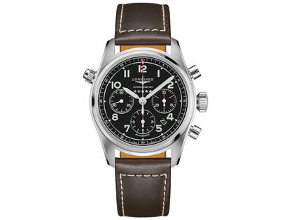 Longines Spirit Automatik Chronograph Edelstahl 42 mm schwarzes Zifferblatt braunes Lederband