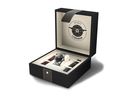 Die Longines Spirit Prestige Edition kommt mit einer exklusiven Sonderverpackung. Diese enthält zusätzlich ein braunes Nato-Lederband und ein dunkelbraunes Lederband mit Ziernaht.
