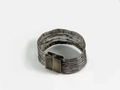 Designschmuck aus Polen, raffinierter Armreif aus anthrazitfarbenem Stahlgewebe (graphit), mit geschwärztem 925/- Silberverschluss (Magnet), 32 mm breit