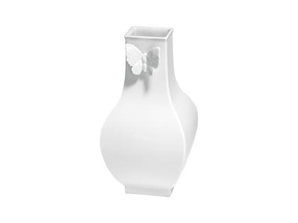 Als hätte er sich eben niedergelassen, die Flügel noch in leichter Bewegung, sitzt der Schmetterling auf dem Bauch der Vase. Ein erster Frühlingsbote, der heitere Leichtigkeit verströmt. In akkurater Bossierarbeit entstehen der Schmetterlingskörper, werden die einzelnen Regionen, Adern und Zellen der Flügel herausgearbeitet und diese schließlich angesetzt. Im Kontrast zu der detailreichen filigranen Verzierung steht die moderne Vasenform mit klaren Linien, bauchigem Körper und eckiger Öffnung. Ein lebhaftes Zusammenspiel traditionellen Kunsthandwerks und zeitgenössischem Design, festgehalten in feinstem Porzellan.