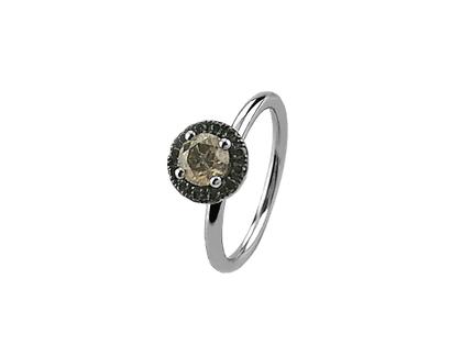 Ring aus 750/- Weißgold poliert, mit 1 Brillant 0,560 ct light yellow P1 und 12 Brillanten zusammen 0,140 ct green heated-si - nur noch in Weite 53 erhältlich
