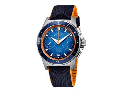 Automatikwerk MU 9419, 62 Stunden Gangreserve, Spechthalsregulierung, Sekundenstopp, Datumschnellkorrektur, Edelstahlgehäuse poliert/satiniert, blaue Keramik-Lünette, verschraubte Krone, Durchmesser 42,5 mm, Höhe 15,5 mm, blaues Zifferblatt mit Struktur, Datum auf 6 Uhr, dunkelblaues Leder-Kautschukband mit orangefarbener Innenseite und Dornschließe, Saphirglas entspiegelt, Glasboden, 30 bar wasserdicht
