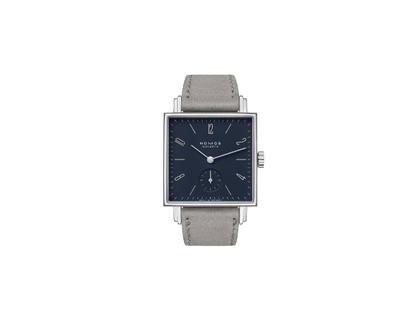 aus der Serie Sinfonie - anlässlich des 250. Geburtstags von Ludwig van Beethoven, Manufakturwerk mit Handaufzug, Nomos Kaliber Alpha, 43 Stunden Gangreserve, Edelstahlgehäuse, 29,5 mm x 29,5 mm, Höhe 6,5 mm, dunkelblaues Zifferblatt mit separater kleiner Sekunde, graues Velourslederband mit Dornschließe, Saphirglas, Saphirglasboden,  3 bar wasserdicht