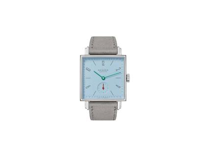Manufakturwerk mit Handaufzug, Nomos Kaliber Alpha, 43 Stunden Gangreserve, Edelstahlgehäuse, 29,5 mm x 29,5 mm, Höhe 6,5 mm, azurblaues Zifferblatt mit separater kleiner Sekunde, graues Velourslederband mit Dornschließe, Saphirglas, Glasboden, 3 bar wasserdicht