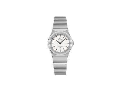 Dieses 28 mm große Modell in Edelstahl verfügt über eine mit römischen Ziffern gravierte Lünette, ein kristallweißes versilbertes Zifferblatt und ein kratzresistentes Saphirglas. Die geschwärzten Zeiger, das OMEGA Logo, der Constellation-Stern und die Indizes bieten einen wunderschönen Kontrast zum weißen Zifferblatt. Das Herzstück dieser Uhr bildet das OMEGA Kaliber 4061. Auf dem Gehäuseboden findet sich eine Prägung des Constellation-Observatoriumsmedaillons.