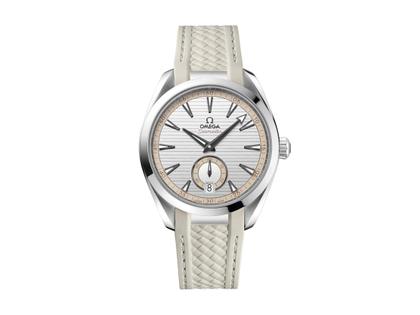 Schweizer Automatikwerk Omega 8916 mit einer Gangreseve von 60 Stunden, Co-Axial Hemmung, Chronometer, poliertes Edelstahlgehäuse im Durchmesser von 41,0 mm, Höhe 13,2 mm, Edelstahl-Krone und Lünette, silberbeiges Zifferblatt mit Datumsanzeige auf 6 Uhr, kleine Sekunde, geschärzte Stunden- und Minutenzeiger mit weißer Super-LumiNova Leuchtmasse, schwarzer Sekundenzeiger mit weißer Super-LumiNova, schwarze Indizes mit weißer Super-LumiNova Leuchtmasse, beigfarbenes Kautschukband mit Faltschließe, gewölbtes Saphirglas, kratzresistent und beidseitig anti‑reflektierend, Edelstahl-Gehäuseboden mit Saphirglas-Einsatz, 15 bar wasserdicht