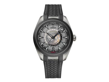 Diese 43 mm große Worldtimer mit einem Gehäuse aus gebürstetem Titan Grade 2 verfügt über ein integriertes Armband aus schwarzem strukturiertem Kautschuk mit zusätzlichem Zierglied und Schließe aus gebürstetem Titan. In der Mitte des schwarzen Zifferblatts, das von einer Lünette aus gebürsteter schwarzer Keramik eingerahmt wird, hat OMEGA eine Vision der Erde aus Sicht des Nordpols geschaffen, indem Kontinente und Farben auf eine Oberfläche aus Titan Grade 5 gelasert wurden. Um die topografische Karte herum ist eine 24-Stunden-Anzeige angebracht, die in Tag- und Nachtabschnitte unterteilt ist. Die Heimatstadt OMEGAs, Biel in der Schweiz, ist eine der vielen weltweiten Städte, die das Zifferblatt und seinen Außenring umkreisen. Alle Ortsnamen, mit Ausnahme der britischen Hauptstadt, sind grau. London ist in Rot dargestellt, um die Greenwich Mean Time hervorzuheben, die nunmehr offiziell als koordinierte Weltzeit (UTC) bekannt ist. Um die matte Optik des Zifferblatts zu ergänzen, hat sich OMEGA für geschwärzte Zeiger und Indizes entschieden, die mit weißer Super-LumiNova gefüllt sind, die im Dunkeln blau leuchtet. Angetrieben wird die Uhr von OMEGAs Co-Axial Master Chronometer Kaliber 8938.