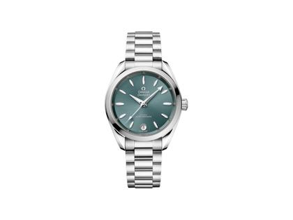 Die Seamaster Aqua Terra ist eine Hommage an OMEGAs großes maritimes Erbe. Dieses 34-mm-Modell besitzt ein symmetrisches Edelstahlgehäuse, dessen verschraubter Gehäuseboden mit einem Wellendesign versehen ist. Das lagunengrüne Zifferblatt aus Messing ist lackiert und von der Mitte aus mit einem Sonnenschliff versehen. Bei 6 Uhr befindet sich ein Datumsfenster, und die Zeiger, Indizes sowie das OMEGA Logo bestehen aus diamantpoliertem 18 K Weißgold. Die Uhr wird von einem integrierten Armband mit polierten Mittelgliedern und gebürsteten Außengliedern am Handgelenk gehalten und von dem OMEGA Co-Axial Master Chronometer Kaliber 8800 angetrieben, das vom Eidgenössischen Institut für Metrologie (METAS) zertifiziert wurde und höchsten Branchenstandards entspricht.