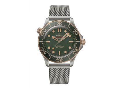 Seit 1993 hat die Seamaster Diver 300M eine begeisterte Anhängerschaft. Die moderne Kollektion von heute hat das berühmte maritime Erbe aufgegriffen und mit OMEGAs innovativsten Ideen und fortschrittlichstem Design bereichert. Das 42-mm-Gehäuse wurde aus Titan Grade 2 und OMEGAs exklusivem 9 K Bronze-Gold gefertigt. Es verfügt über einen grünen, mit Oxalsäure eloxierten Lünettenring aus Aluminium mit einer Tauchskala aus Vintage-Super-LumiNova. Für das Zifferblatt wurde sandgestrahltes, grünes Aluminium verwendet. Die Zeiger sind mit einer PVD-Beschichtung aus 18 K Bronze-Gold versehen, die Indizes sind geschwärzt. Alle verfügen über eine Füllung mit Vintage-Super-LumiNova. Die anderen Markierungen, darunter das OMEGA Logo, wurden in Hellbraun und Rot aufgedruckt. Am Handgelenk gehalten wird die Uhr von einem gebürsteten Milanaise-Armband mit Schließe, für den Antrieb sorgt das OMEGA Co-Axial Master Chronometer Kaliber 8806, das durch den Saphirglasboden mit Wellendesign bewundert werden kann.