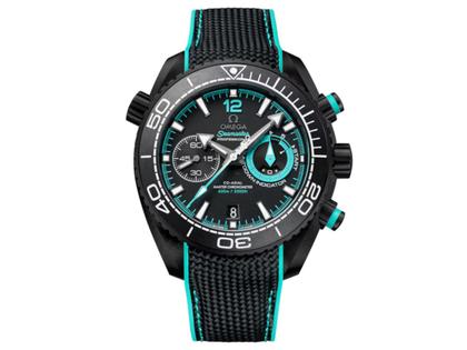 Omega Seamaster Planet Ocean 600M Chronograph ETNZ Deep Black Automatik Keramik 45,5mm schwarzes Zifferblatt schwarz türkises Kautschukband