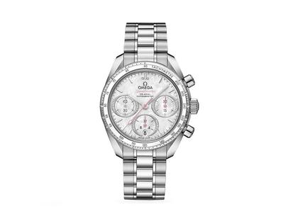 Auch wenn sich die Speedmaster 38 mm-Kollektion in ästhetischer Hinsicht an einer bestimmten Form von Schlichtheit, Größe und Farbe orientiert, bleibt sie dem Erscheinungsbild und uhrmacherischen Erbe von OMEGAs berühmtestem Chronographen treu. Dieses Modell verfügt über ein Gehäuse aus Edelstahl und eine Lünette, zu der eine Tachymeterskala auf einem weißen Keramikring gehört. Das weiße Perlmuttzifferblatt ist mit horizontal ausgerichteten ovalen und diamantbesetzten Hilfszifferblättern und einem vertikal ausgerichteten ovalen Datumsfenster bei 6 Uhr bestückt. Während die Indizes rhodiniert sind, sind die Zeiger entweder ebenfalls rhodiniert oder aber rosa. Die Uhr wartet mit einem Edelstahlarmband sowie einem Seepferdchen-Medaillon auf dem Gehäuseboden auf und wird von OMEGAs Co-Axial Kaliber 3330 angetrieben.