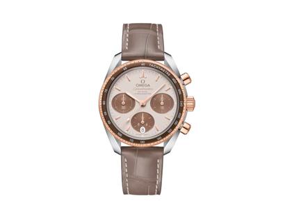 Auch wenn sich die Speedmaster 38 mm-Kollektion in ästhetischer Hinsicht an einer bestimmten Form von Schlichtheit, Größe und Farbe orientiert, bleibt sie dem Erscheinungsbild und uhrmacherischen Erbe von OMEGAs berühmtestem Chronographen treu. Dieses Modell verfügt über ein Gehäuse aus Edelstahl und 18 K Sedna™-Gold mit einer polierten und gebürsteten Goldlünette, zu der eine Tachymeterskala auf einem braunen Aluminiumring gehört. Das „Cappuccino“-Zifferblatt ist mit horizontal ausgerichteten braunen ovalen Hilfszifferblättern und einem vertikal ausgerichteten ovalen Datumsfenster bei 6 Uhr bestückt. Während die Indizes und Zeiger aus 18 K Sedna™-Gold bestehen, sind der Stunden-, Minuten- und Chronographensekundenzeiger mit weißer Super-LumiNova beschichtet.
