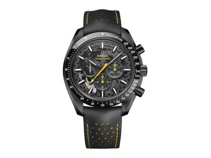 Als Teil aller sechs Mondlandungen der Geschichte ist die legendäre OMEGA Speedmaster eine wahre Weltraumikone und Symbol für OMEGAs Pioniergeist. Dieses 44,25-mm-Modell mit geschwärztem Uhrwerk, dessen Hauptplatine und Brücken zur Darstellung der Mondoberfläche per Laser bearbeitet wurden, ist eine Hommage an die Geschichte der Speedmaster an Bord der Mission Apollo 8. Die nahe Seite ist durch das skelettierte, schwarze, eloxierte Aluminiumzifferblatt zu sehen, die ferne Seite durch den Gehäuseboden. Die gesamte Uhr, die mit einem perforierten schwarzen Kautschukarmband mit gelber Kautschukinnenseite ausgestattet ist, besteht aus schwarzer Keramik und verfügt über einen gelb lackierten Chronographensekundenzeiger sowie eine lasergravierte Tachymeterskala auf der Lünette, die mit weißem Email gefüllt ist. Das Hilfszifferblatt für die kleine Sekunde (Patent angemeldet) ist mit einem Zeiger aus Titan Grade 5 versehen, der wie die Rakete Saturn V geformt ist. Die 3D-Form wurde durch eine Laserbearbeitung erzielt, während die Farben durch weißen Lack, Ablation und Laserschwärzung entstanden sind. Das speziell dekorierte Uhrwerk ist das OMEGA Co-Axial Master Chronometer Kaliber 3869. Zu den Gravuren auf dem Gehäuseboden zählen „APOLLO 8, DEC 1968“, „DARK SIDE OF THE MOON“, „WE’LL SEE YOU ON THE OTHER SIDE“ und „CO-AXIAL MASTER CHRONOMETER“.