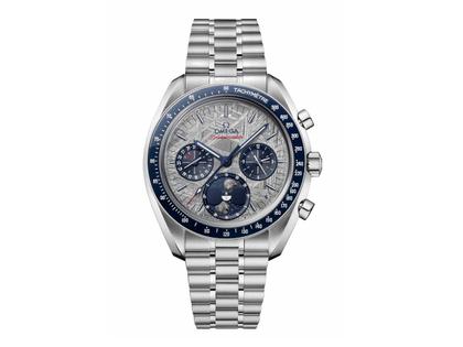 Die Speedmaster, die bei allen sechs Mondmissionen dabei war, gehört zu OMEGAs legendärsten Zeitmessern. Mit ihren zwei Monden aus echtem Mondmeteorit ist diese 43-mm-Uhr mit Mondphase eine faszinierende Hommage an dieses bedeutende Vermächtnis. Ihr Zifferblatt, eine in Grau galvanisierte Platte aus Meteorit, ist mit blau beschichteten Zeigern für Stunden und Minuten sowie Indizes aus 18 K Weißgold versehen. Die Zeiger auf den beiden blau beschichteten Hilfszifferblättern wurden ebenfalls aus 18 K Weißgold gefertigt. Bei 6 Uhr befindet sich die einzigartige Anzeige der Mondphasen auf der nördlichen und der südlichen Hemisphäre. Sie ist mit zwei Monden aus geformtem, poliertem und gewölbtem Meteorit versehen, der auf die Erde gefallen ist. Das Gehäuse aus poliertem und gebürstetem Edelstahl wird von einem Lünettenring aus polierter blauer Keramik mit Tachymeterskala aus weißer Emaile ergänzt. Am Handgelenk gehalten wird die Uhr von einem Armband aus poliertem und gebürstetem Edelstahl. Es verfügt über den gleichen patentierten Komfortverschluss wie die berühmte Speedmaster. Für den Antrieb sorgt das OMEGA Co-Axial Master Chronometer-Kaliber 9914 mit Chronograph und Handaufzug, das offiziell von METAS zertifiziert wurde.
