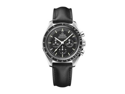 Die Speedmaster Moonwatch gehört zu den legendärsten Zeitmessern der Welt. Der beeindruckende Chronograph, der bei allen sechs Mondlandungen dabei war, verkörpert perfekt den risikofreudigen Pioniergeist der Marke. Diese 42-mm-Moonwatch aus Edelstahl wird von einem schwarzen Lederarmband am Handgelenk gehalten. Als Uhrglas und Gehäuseboden dient Saphirglas. Inspiriert von der 4. Generation der Speedmaster, die auf dem Mond getragen wurde, besitzt das Modell auch ein asymmetrisches Gehäuse mit appliziertem OMEGA Logo, ein schwarz abgestuftes Zifferblatt und den berühmten Punkt über der 90 auf dem Lünettenring aus eloxiertem Aluminium.