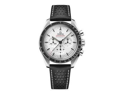 Die Speedmaster Moonwatch gehört zu den legendärsten Zeitmessern der Welt. Der beeindruckende Chronograph, der bei allen sechs Mondlandungen dabei war, verkörpert perfekt den risikofreudigen Pioniergeist der Marke. Diese 42-mm-Moonwatch aus Edelstahl wird von einem mikroperforierten, schwarzen Lederarmband mit rot-weißer Naht am Handgelenk gehalten. Als Uhrglas und Gehäuseboden dient Saphirglas. Inspiriert von der 4. Generation der Speedmaster, die auf dem Mond getragen wurde, besitzt das Modell auch ein asymmetrisches Gehäuse, ein weiß lackiertes, abgestuftes Zifferblatt mit appliziertem OMEGA Logo und applizierten Indizes, Zeiger im Moonwatch-Stil und den berühmten Punkt über der 90 auf dem Lünettenring aus schwarzem, eloxiertem Aluminium. Angetrieben wird die Uhr von dem OMEGA Co-Axial Master Chronometer Kaliber 3861, das neben der zentralen Chronographenfunktion über eine kleine Sekunde, einen 30-Minuten-Zähler und einen 12-Stunden-Zähler verfügt.