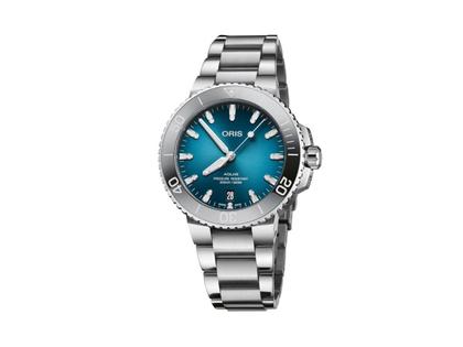 Die Oris Aquis Date greift das spektakuläre Zifferblatt der Limited Edition Clean Ocean mit auf.