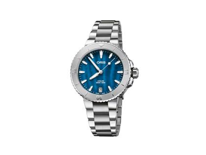 Automatikwerk (Oris 733), 38 Stunden Gangreserve, Edelstahlgehäuse poliert/satiniert, Durchmesser 36,5 mm, einseitig drehbare Lünette aus Edelstahl, verschraubte Sicherheitskrone, blaues Perlmutt-Zifferblatt mit Datum auf 6 Uhr, Zeiger und Indizes mit Super-LumiNova®, Edelstahlarmband mit Faltschließe, gewölbtes Saphirglas, innen entspiegelt, verschraubter Edelstahlboden mit Mineralglas-Sichtfenster, 30 bar wasserdicht