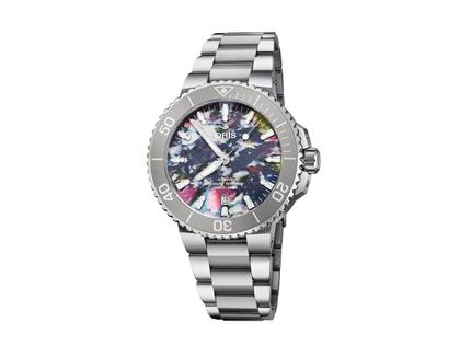 Automatikuhr, Oris Kaliber 733, 38 Stunden Gangreserve, Edelstahlgehäuse im Durchmesser von 41,5 mm, Lünette mit grauer Keramikeinlage, Minutenskala, buntes Zifferblatt aus recyceltem PET-Plastik, Datumsanzeige, Zentralsekunde, mit Super-LumiNova®,  Saphirglas, Glasboden, Edelstahlarmband mit Faltschließe, 30 bar wasserdicht