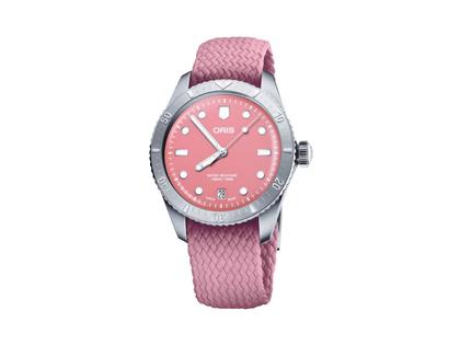 Automatikwerk Kaliber Oris 733 (Basis SW 200-1), 38 Stunden Gangreserve, Edelstahlgehäuse poliert/satiniert, Durchmesser von 38,0 mm, Lünette mit Minutenskala, verschraubte Krone, pinkes Zifferblatt "Lipstick Pink" mit Datumsanzeige, Superluminova, pinkes recyceltes Perlon-Textilband mit Dornschließe, Saphirglas gewölbt und entspiegelt, Edelstahlboden, 10 bar wasserdicht