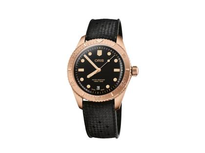 Da ist sie wieder, die wohl bekannte Retro-Taucheruhr. Doch dieses Mal in der Variante Cotton Candy Sepia. Diese Uhr kommt mit einen Gehäuse aus Bronze und einem tiefschwarzen Zifferblatt daher. Zeiger und Stundenindizes sind golden eingerahmt. Für das Armband stehen schwarzes Kautschuk oder Bronze zur Wahl. Eine Farbkombination, die an Tabak erinnert und mit der Zeit an Charakter gewinnt. Sogar das Oris-Logo wurde in einem rauchigen Bronze-Ton gehalten. Eine Uhr, die einem ein Lächeln auf das Gesicht zaubert.
