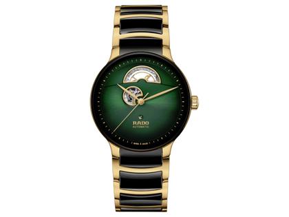 Entdecken Sie mit der Rado Centrix Automatic Open Heart das perfekte Gleichgewicht zwischen Innovation und Ästhetik. Im Herzen dieses Meisterwerks tickt das Rado Automatikwerk R734, das für makellose Präzision und Zuverlässigkeit sorgt. Mit einer beeindruckenden Gangreserve von 80 Stunden garantiert diese Uhr eine kontinuierliche Leistung. Die Präzision dieser Uhr wird durch die antimagnetische Nivachron™ Spiralfeder und ihre Einstellung in 5 Lagen weiter erhöht. Mit ihrem eleganten 39,5 mm großen Gehäuse aus poliertem gelbgoldfarbenem Edelstahl steht die Centrix Automatic Open Heart für minutiöse Handwerkskunst. Der Gehäuseboden aus poliertem Edelstahl ist mit einem Saphirglas ausgestattet und bietet einen Blick auf das faszinierende Innenleben der Uhr. Das Zifferblatt zeigt eine faszinierende Farbabstufung von Grün zu Schwarz, die dem Uhrendesign noch mehr Tiefe und Reiz verleiht. Abgerundet wird das Zifferblatt durch gelbgoldfarbene Zeiger, die für eine ausgezeichnete Lesbarkeit und einen Hauch von Eleganz sorgen. Das Armband verfügt über Mittelglieder aus poliertem gelbgoldfarbenem Edelstahl und schwarzer Hightech-Keramik, die einen markanten Kontrast erzeugen.