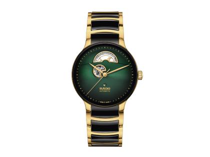 Rado Centrix Open Heart Automatik Edelstahl Gelbgold-PVD 39,5mm grünes Zifferblatt Metallband