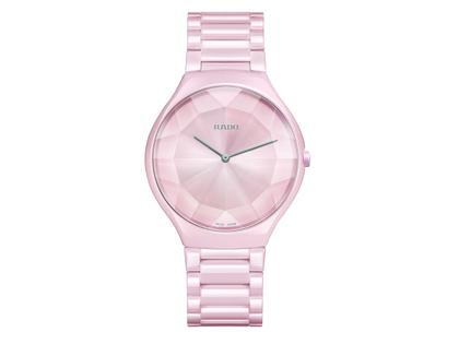 Quarzwerk (Kaliber R420), rosa Monobloc-Gehäuse aus Hightech-Keramik, Durchmesser 39,0 mm, Höhe 5,0 mm, silbernes Zifferblatt mit Farbverlauf zu Zartrosa, rosa Hightech-Keramikarmband mit Titan-Faltschließe, facettiertes Saphirglas, Gehäuseboden aus Titan und Saphirglas, 3 bar wasserdicht - limitiert auf 300 Stück