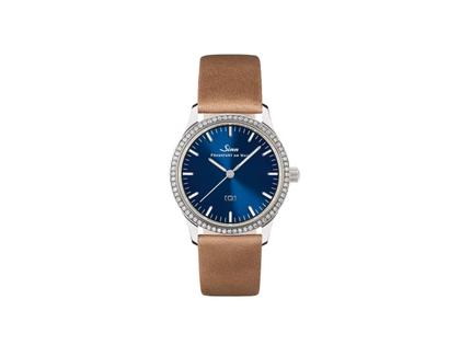 Sinn Spezialuhren 434 TW 68 WG B Quarz Edelstahl 34mm blaues Zifferblatt mit Brillanten braunes Lederband