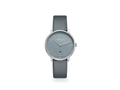 Quarzwerk Ronda 784, Edelstahlgehäuse im Durchmesser von 33,0 mm, Höhe 6,0 mm, blaues, satiniertes Zifferblatt mit Datum auf 6 Uhr und silbernen Zeigern, blaues Lederband mit Dornschließe, gewölbtes, beidseitig entspiegeltes Saphirglas, Edelstahl-Gehäuseboden mit Gravur, 5 bar wasserdicht