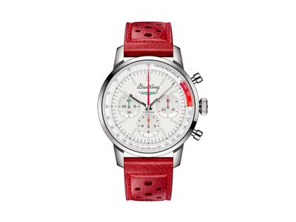 Chronometer Manufakturlaliber Breitling 01 mit einer Gangreserve von 70 Stunden, Edelstahlgehäuse mit einem Durchmesser von 41 mm, Höhe 13,3 mm, weißes Zifferblatt, Glasboden, rotes Kalbslederband mit Faltschließe, beidseitig entspiegeltes Saphirglas, 10 bar wasserdicht