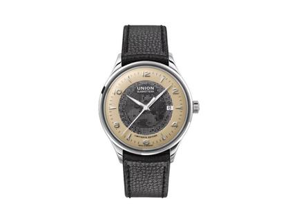 Automatikwerk UNG-07.01, Herrenuhr mit Gangreserve von 60 Stunden, rundes Edelstahlgehäuse, Durchmesser 40 mm, Höhe 9,8 mm, beiges Zifferblatt mit dunklem skelettiertem Mittelteil - in Anlehnung eines Kühlergrills, arabische Ziffern und Indizes, Datumsanzeige, schwarzes Lederband mit Faltschließe, Saphirglas und Saphirglasboden, 10 bar wasserdicht