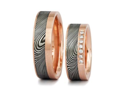 Wagebundt Joachim Bartz Trauringpaar Damaszenerstahl Roségold mit Brillanten 0,105ct
